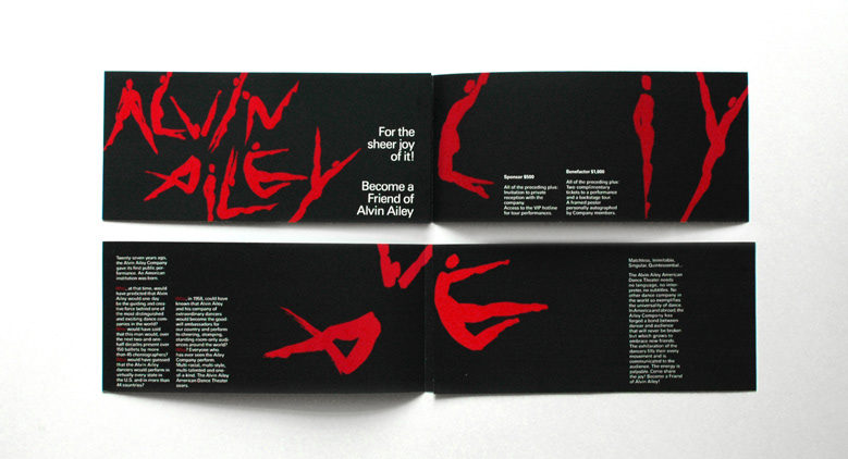Alvin Ailey American Dance Theater New York, New York Design of Logo, promotional materials, anniversary poster, clothing, brochures and print collateral. Rendering the founder’s name as brush-stroke dancers captures the exuberance and vitality that made Ailey’s work internationally famous, while the fuchsia-purple color scheme reflects the diverse cultures and backgrounds of the company’s performers.