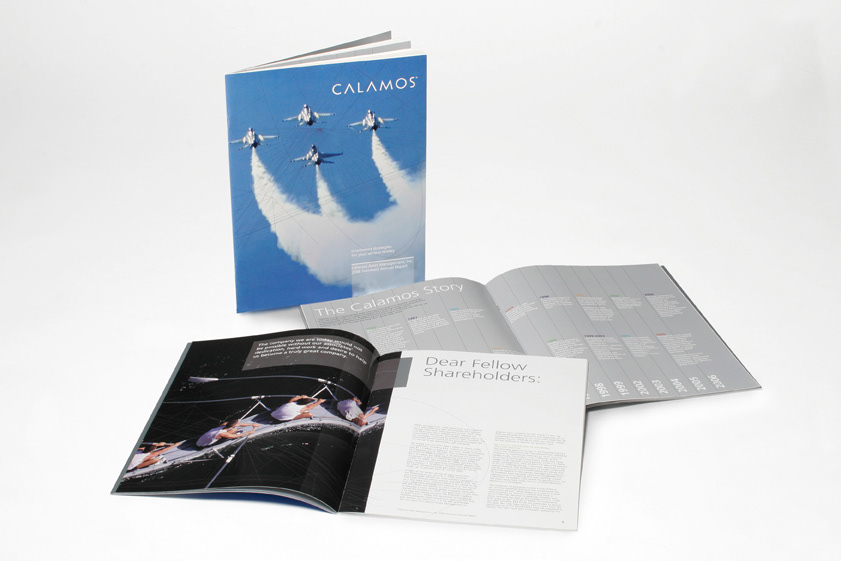 Calamos Investments Brand Identity Naperville, Illinois When John Calamos Sr. transformed $5,000 of his parents’ grocery store savings into their retirement nest egg, Calamos Investments was born. Along the way he pioneered convertible bond investment strategies while advocating that the key to building wealth is managing risk in down markets. After C&G Partners appeared on the CBS Sunday Morning Show during a segment about the creation of logos, John Calamos Sr. commissioned the firm to craft a new tagline and design a new brand identity for Calamos Investments. The initiative coincided with the company’s 30th anniversary and was intended to better reflect the remarkable success of the business. Additionally, a unified visual identity would allow all things Calamos to be linked by a single master brand that could acquire meaning independent of the company’s founder, an objective that reflected the company’s plans for growth. Since the Calamos name is unique, a wordmark was chosen that employs modern letterforms in their utmost simplicity so that they read as abstract symbols yet remain legible as type. Silver, with its metallic sheen, reflects the performance aspect of the business, as well as its monetary rewards. To express the role of information technology in shaping investment decisions, photographs are overlaid with linear patterns drawn from data visualization. Their application reinforces the metaphoric role played by the imagery, while suggesting the deep research the company relies on in order to deliver superior results on a global scale.